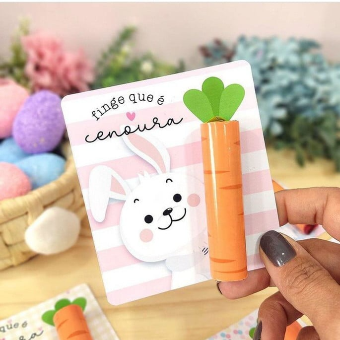 Basta envolver o chocolate batom nas cenourinhas e colar com fita adesiva, tipo durex. Depois, retire a fita dupla face que vem no card e cole o chocolate já envolvido no papel laranja, e seu mimo estará pronto